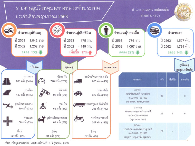 โดยสำนักอำนวยความปลอดภัย ได้สรุปรายงานข้อมูลอุบัติเหตุบนทางหลวงทั่วประเทศประจำ เดือนพฤษภาคม 2563 จากการรายงานอุบัติเหตุทางระบบ HAIMS พบว่า อุบัติเหตุเกิดขึ้นบนทางหลวงในความรับผิดชอบของกรมทางหลวง จำนวน 1,042 ครั้ง ทำให้มีผู้เสียชีวิต 175 คน ได้รับบาดเจ็บทั้งสิ้น 776 คน จำนวน รถที่เกิดอุบัติเหตุ 1,527 คัน เป็นเหตุให้ทรัพย์สินของกรมทางหลวงเสียหายประมาณ 12 ล้านบาท เมื่อเปรียบเทียบสถิติอุบัติเหตุประจำเดือนพฤษภาคม ๒๕62 จำนวนอุบัติเหตุลดลงจากปีที่ผ่านมา 13% ผู้เสียชีวิตเพิ่มขึ้น 17% บาดเจ็บลดลง 29% จำนวนรถที่เกิดอุบัติเหตุลดลง 14%