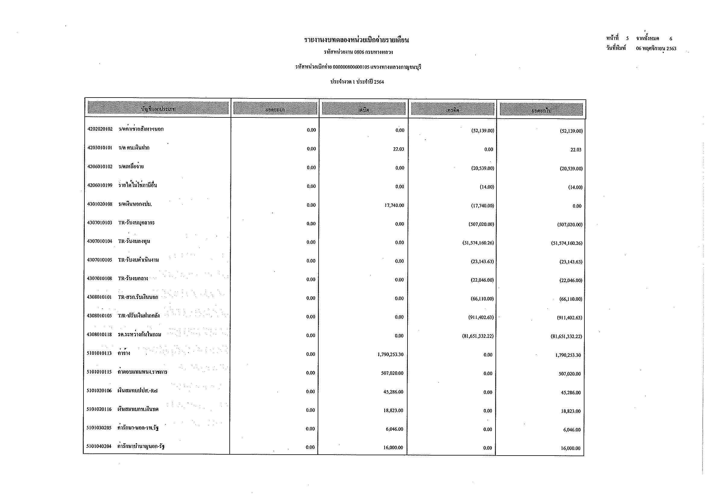 ข้อมูลข่าว : รายงานงบทดลองหน่วยเบิกจ่ายรายเดือน ประจำงวด 1 ประจำปีที่ 2564