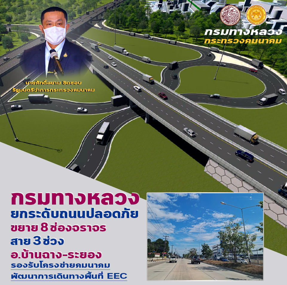 ข้อมูลข่าว : กรมทางหลวงยกระดับถนนปลอดภัยขยาย 8 ช่องจราจร สาย 3 ช่วง อ.บ้านฉาง-ระยอง แก้ไขการจราจรสายหลัก รองรับโครงข่ายคมนาคมขนส่งในอนาคต พัฒนาการเดินทางพื้นที่ EEC ตามนโยบายรัฐบาล ก่อสร้างคืบหน้ากว่า 40 % คาดแล้วเสร็จกลางปี 2566