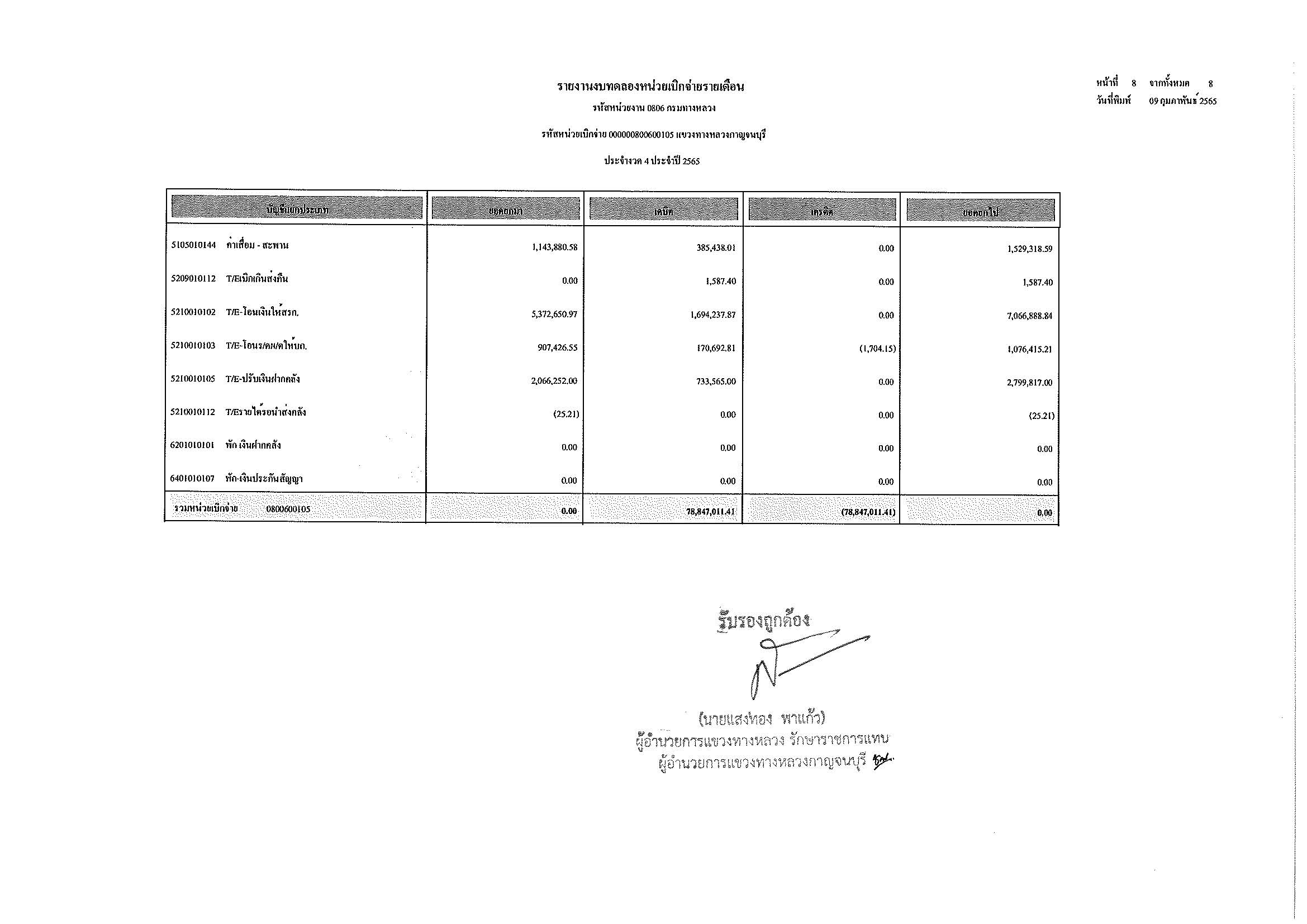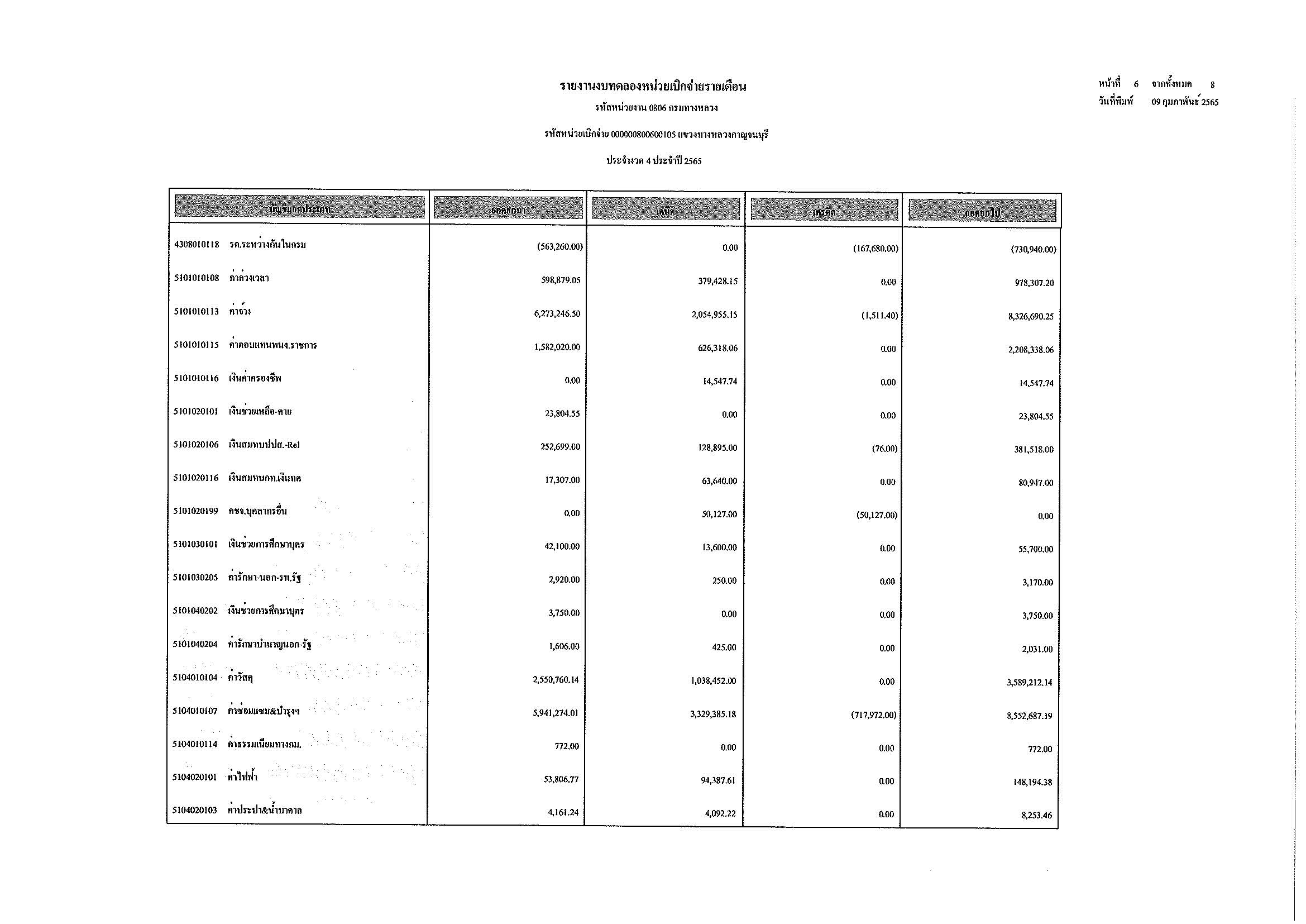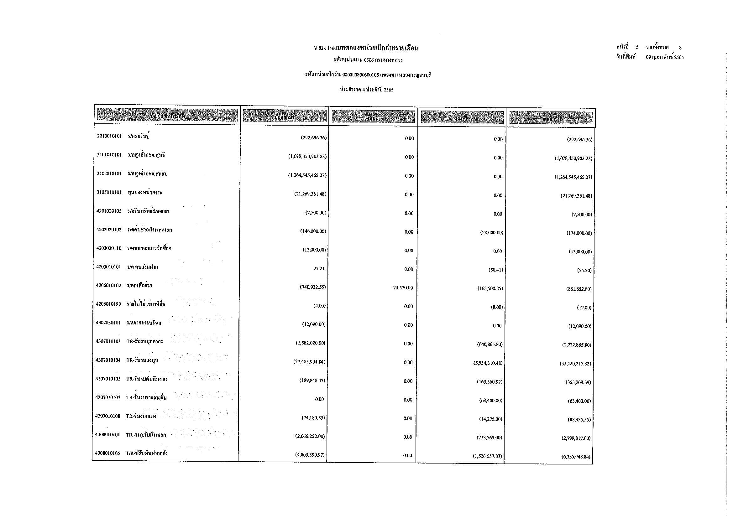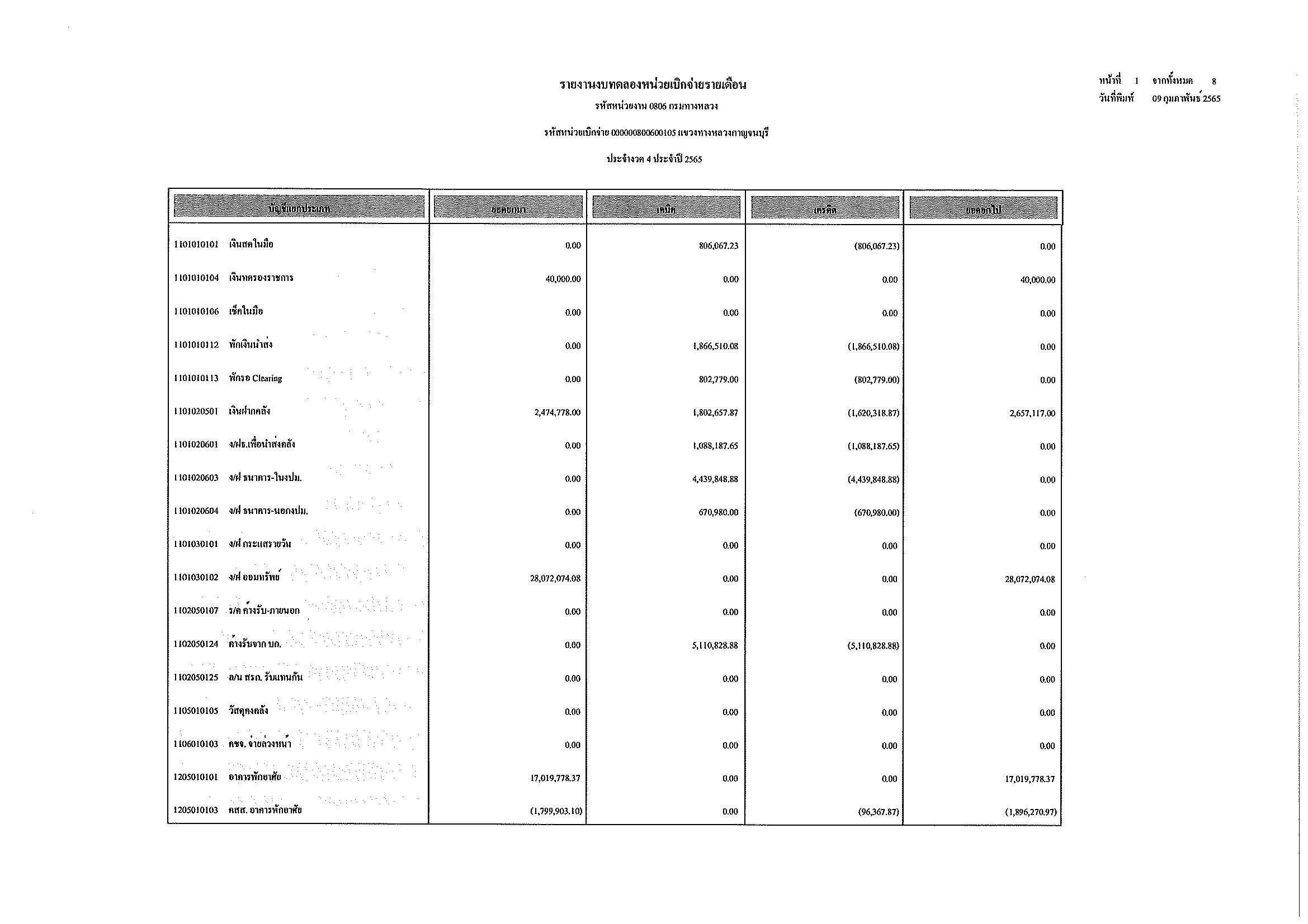รายงานงบทดลองหน่วยเบิกจ่ายรายเดือน ประจำงวด 4 ประจำปีที่ 2565