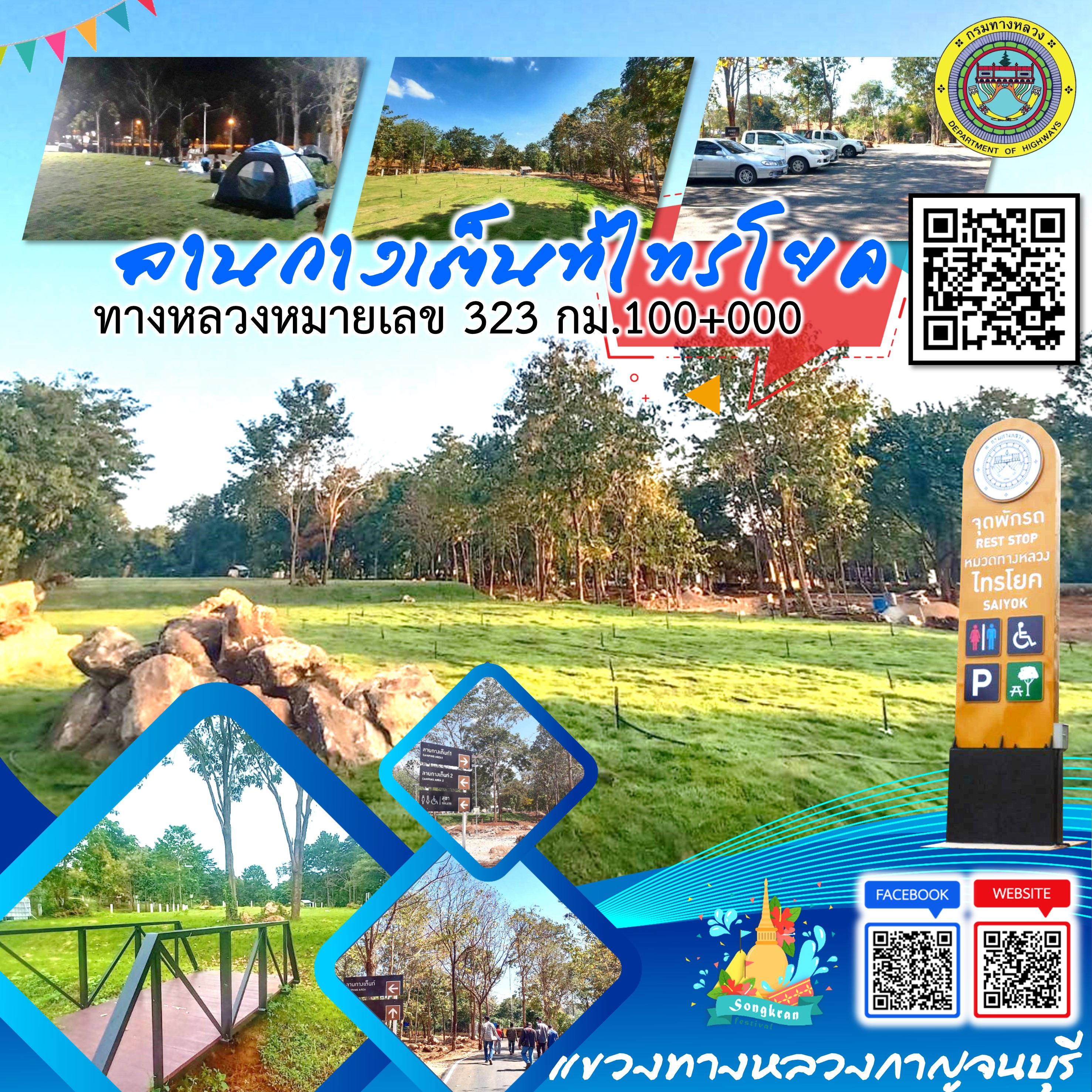 แขวงทางหลวงกาญจนบุรี สำนักงานทางหลวงที่ 12 (สุพรรณบุรี) กรมทางหลวง ให้บริการลานกางเต็นท์ จุดพักรถ ห้องน้ำ และสอบถามข้อมูลต่างๆ สำหรับนักท่องเที่ยวแวะพักใช้บริการ โดยมีเจ้าหน้าที่พร้อมบริการตลอด 24 ชั่วโมง ในช่วงเทศกาลสงกรานต์ 2565