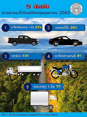 ยานพาหนะที่เกิดอุบัติเหตุส่วนใหญ่ ได้แก่ รถปิคอัพบรรทุก 4 ล้อ 37% (488 คัน) รถยนต์นั่ง 26% (343 คัน)