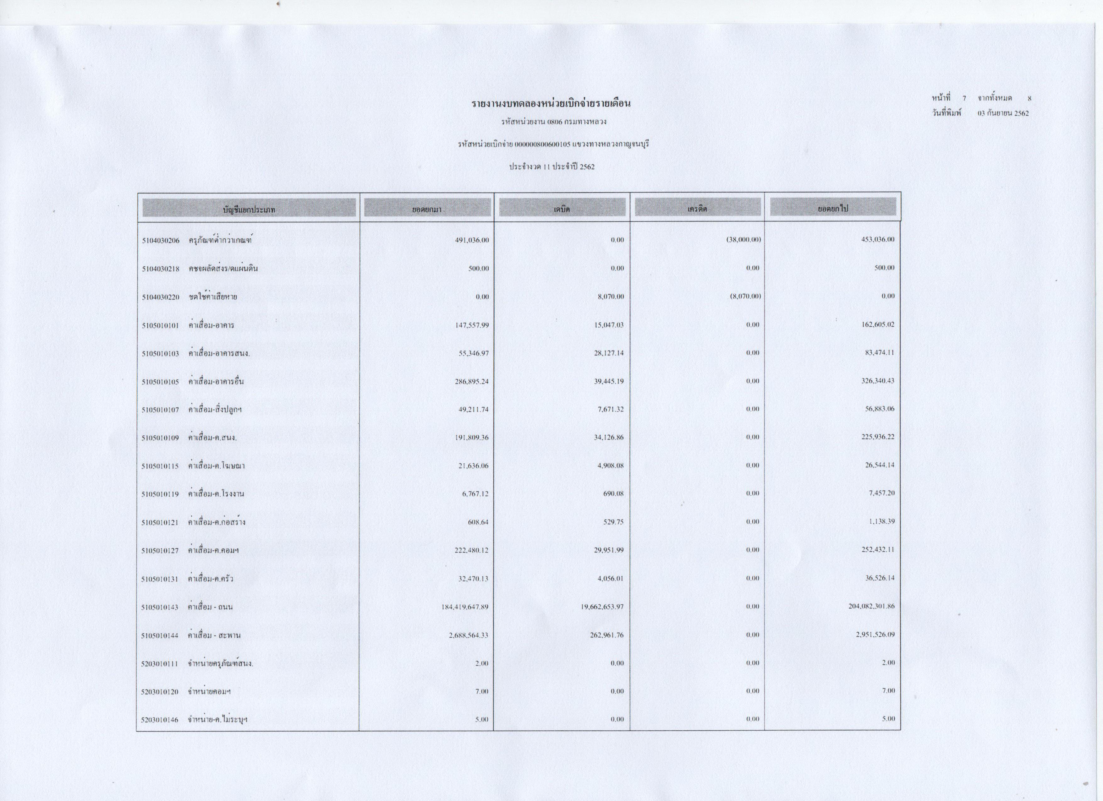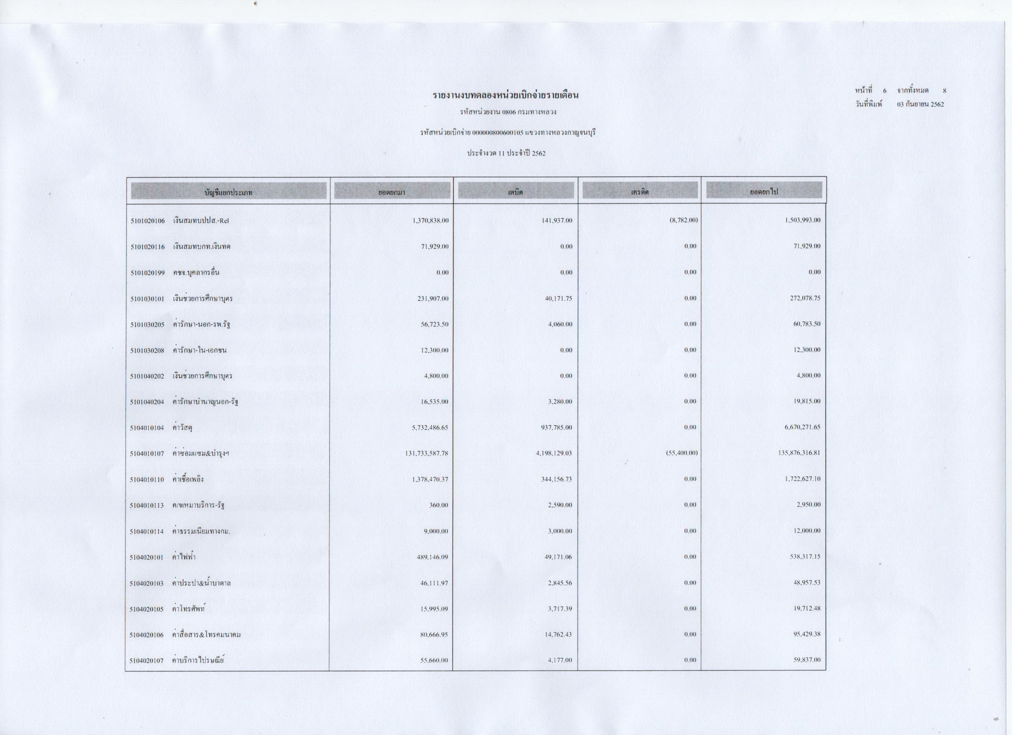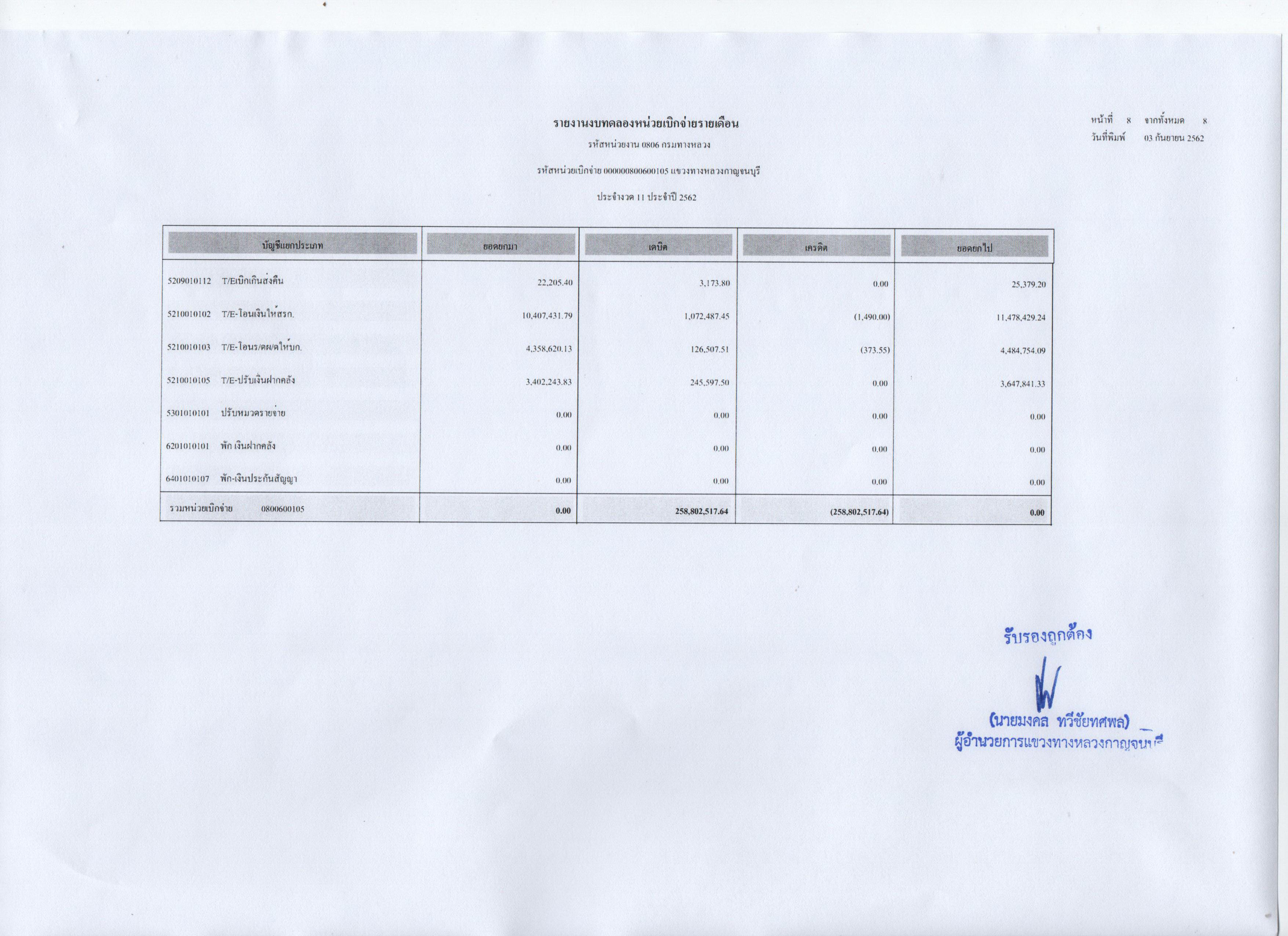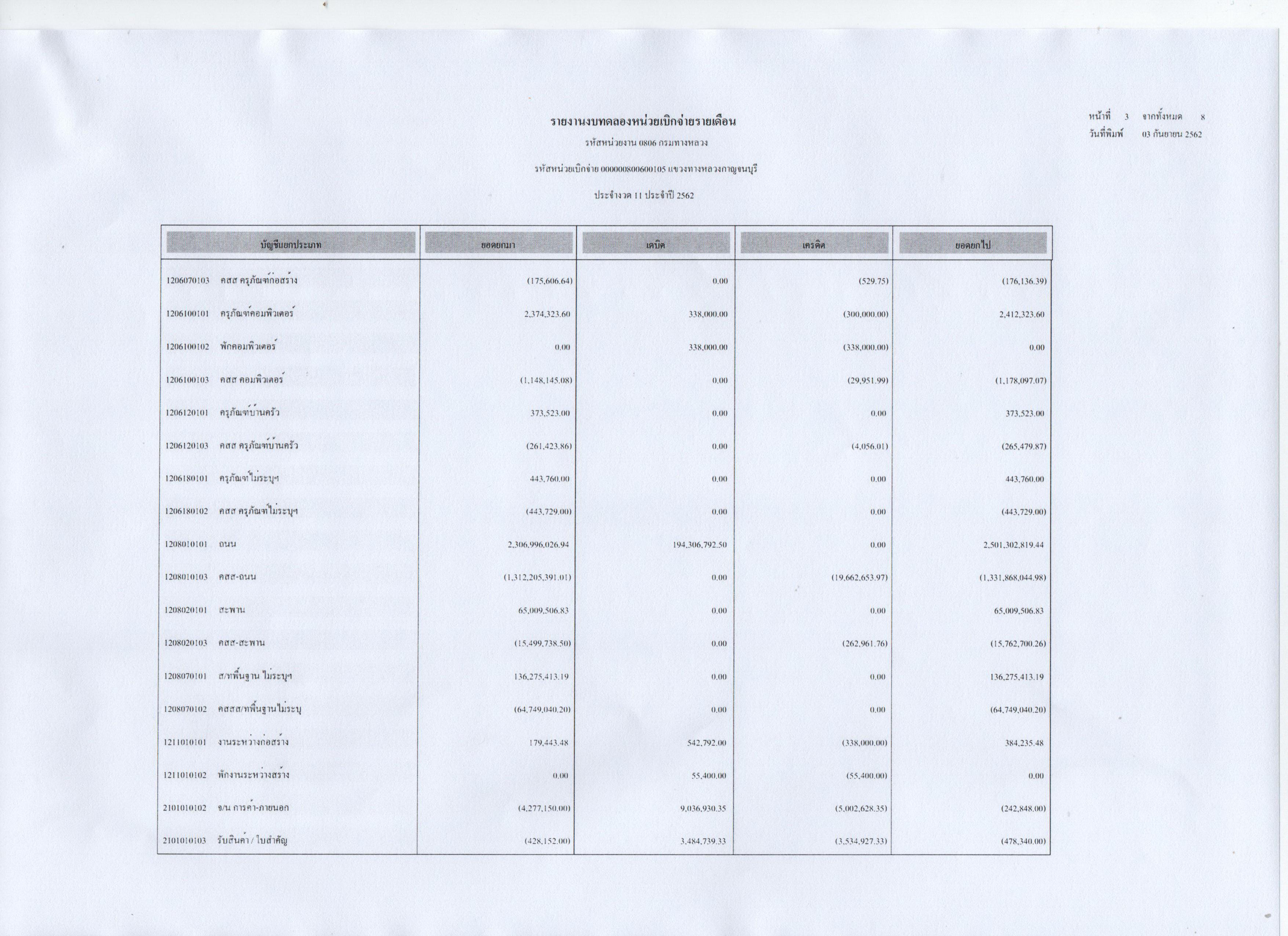 รายงานงบทดลองหน่วยเบิกจ่ายรายเดือน ประจำงวดที่ 11 ประจำปี 2562