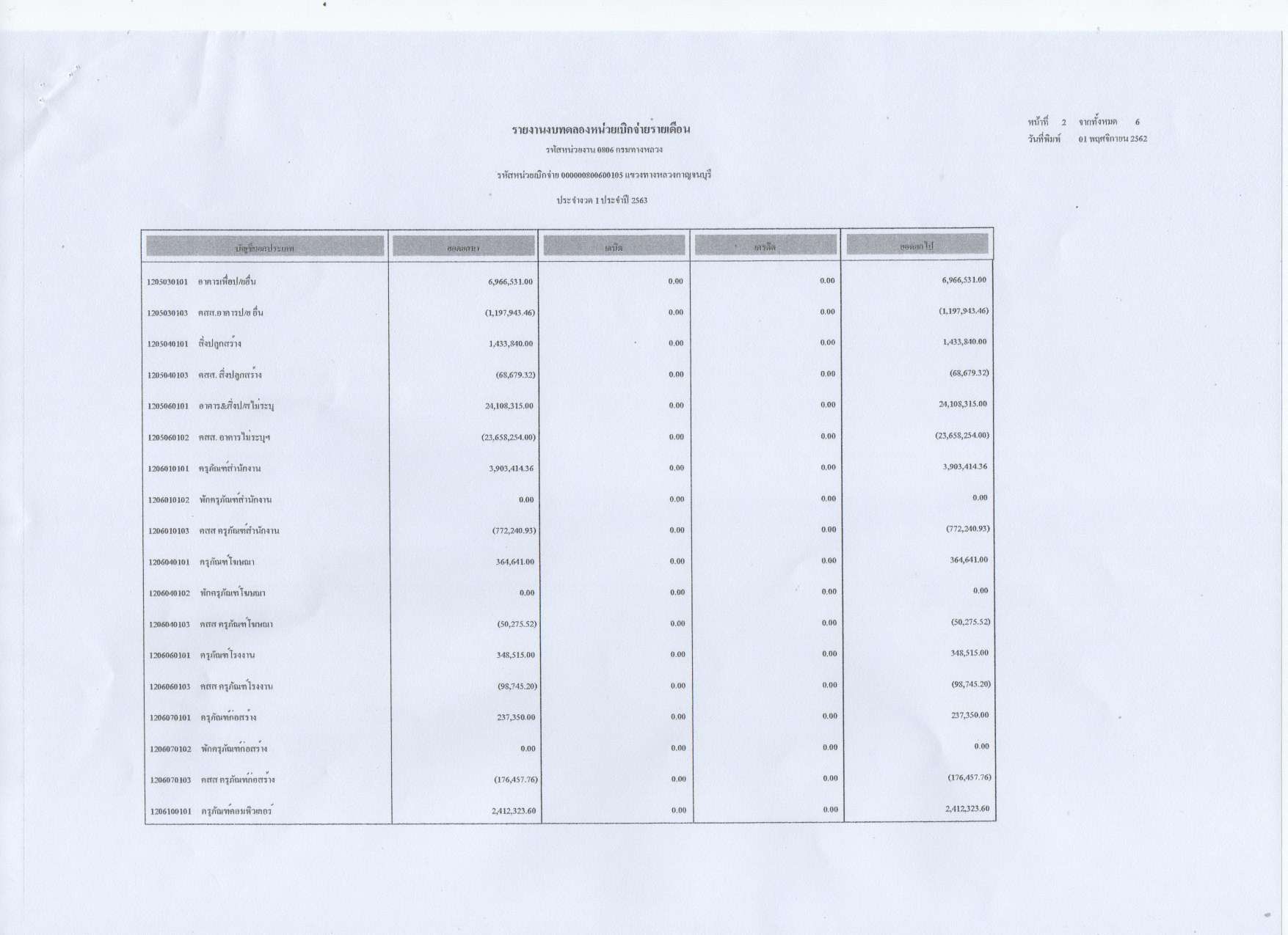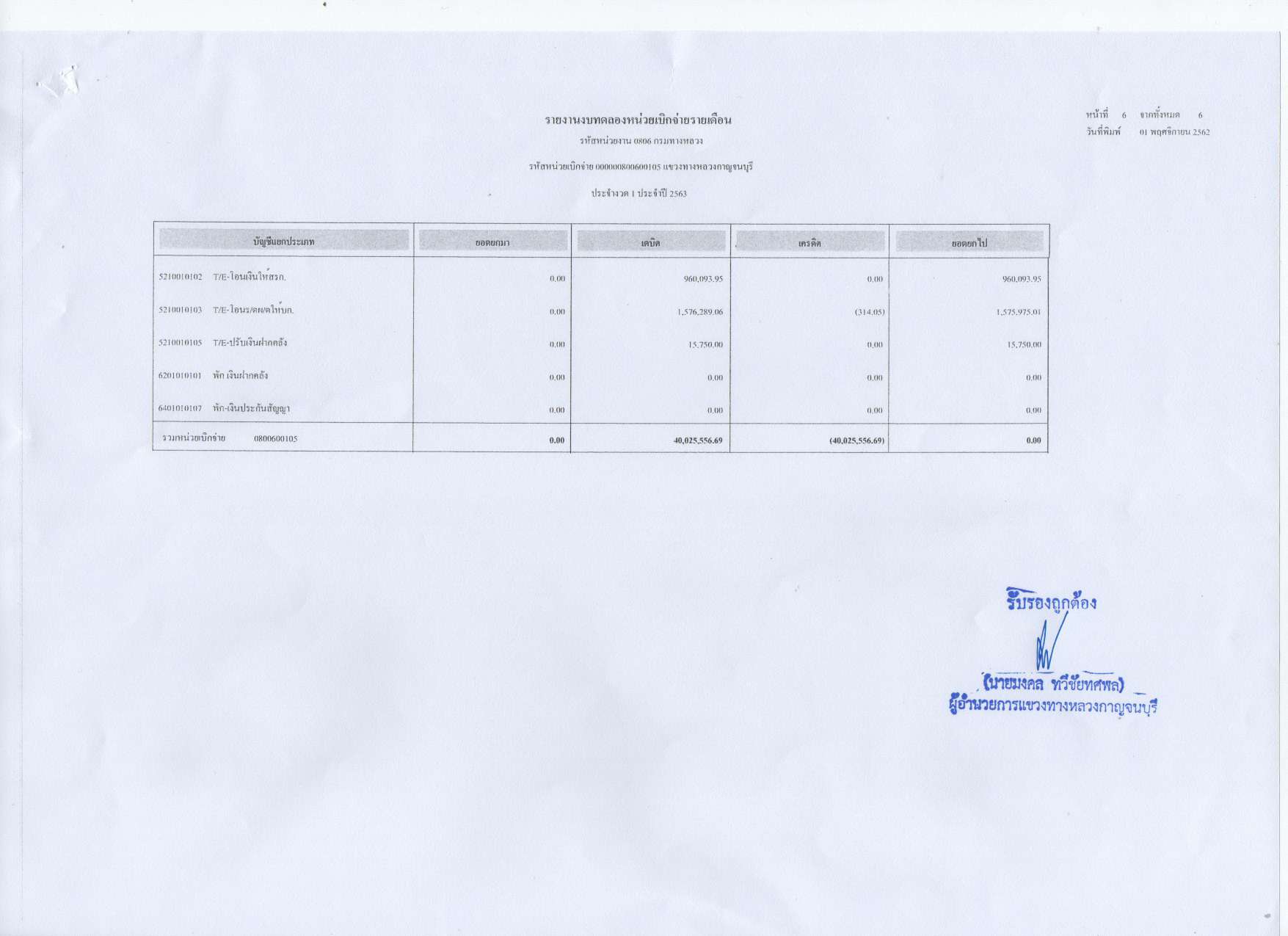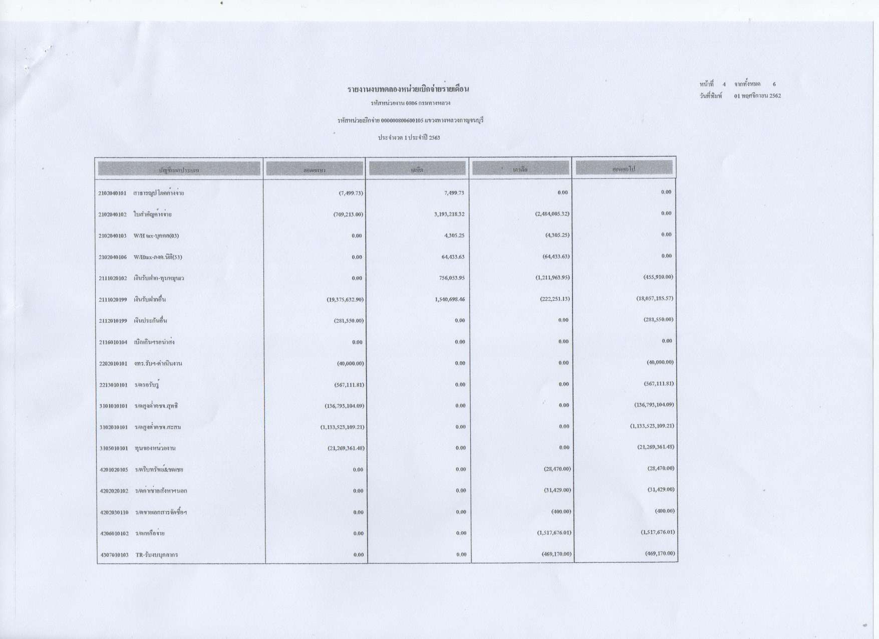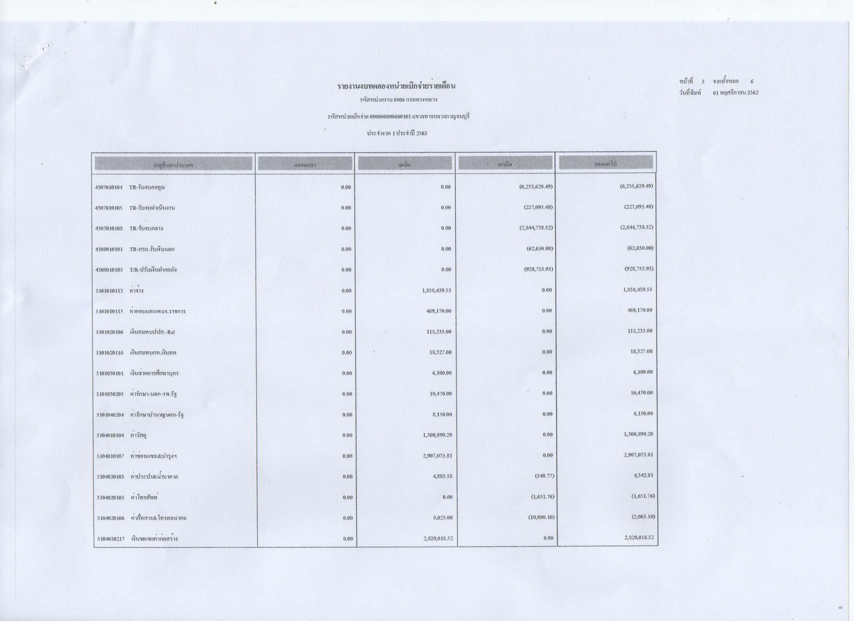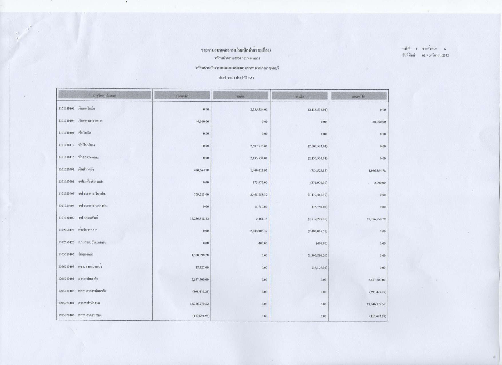 รายงานงบทดลองหน่วยเบิกจ่ายรายเดือน ประจำงวดที่ 1 ประจำปีที่ 2563