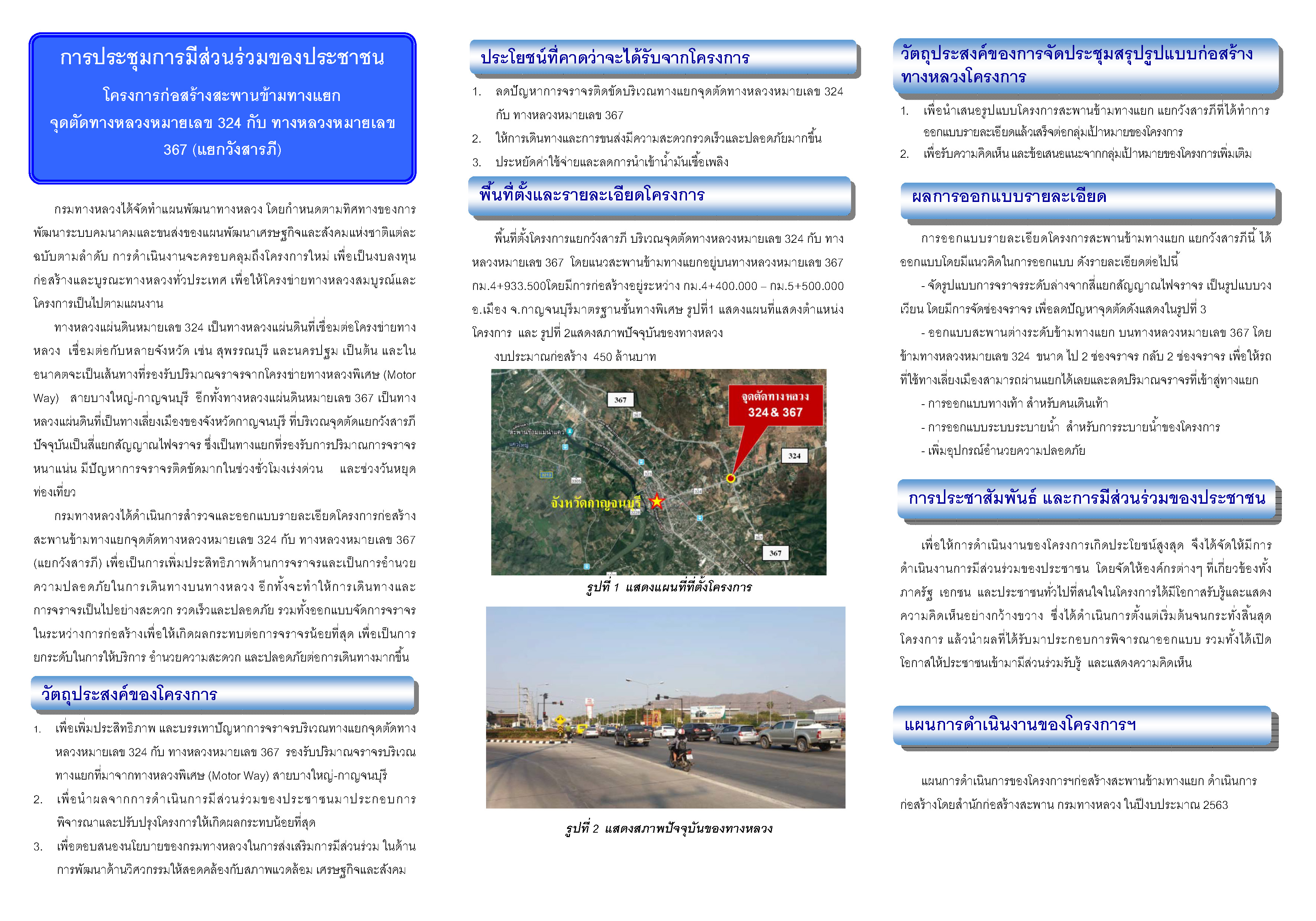 การประชุมการมีส่วนร่วมของประชาชนและประชาสัมพันธ์โครงการ โครงการพัฒนาทางหลวงเพื่อสนับสนุนเขตเศรษฐกิจพิเศษ กิจกรรมก่อสร้างทางหลวงรองรับเขตเศรษฐกิจพิเศษ โครงการก่อสร้างสะพานข้ามทางแยก จุดตัดทางหลวงหมายเลข 324 กับ ทางหลวงหมายเลข 367 (แยกวังสารภี) กม.2+586 ประจำปีงบประมาณ พ.ศ.2563