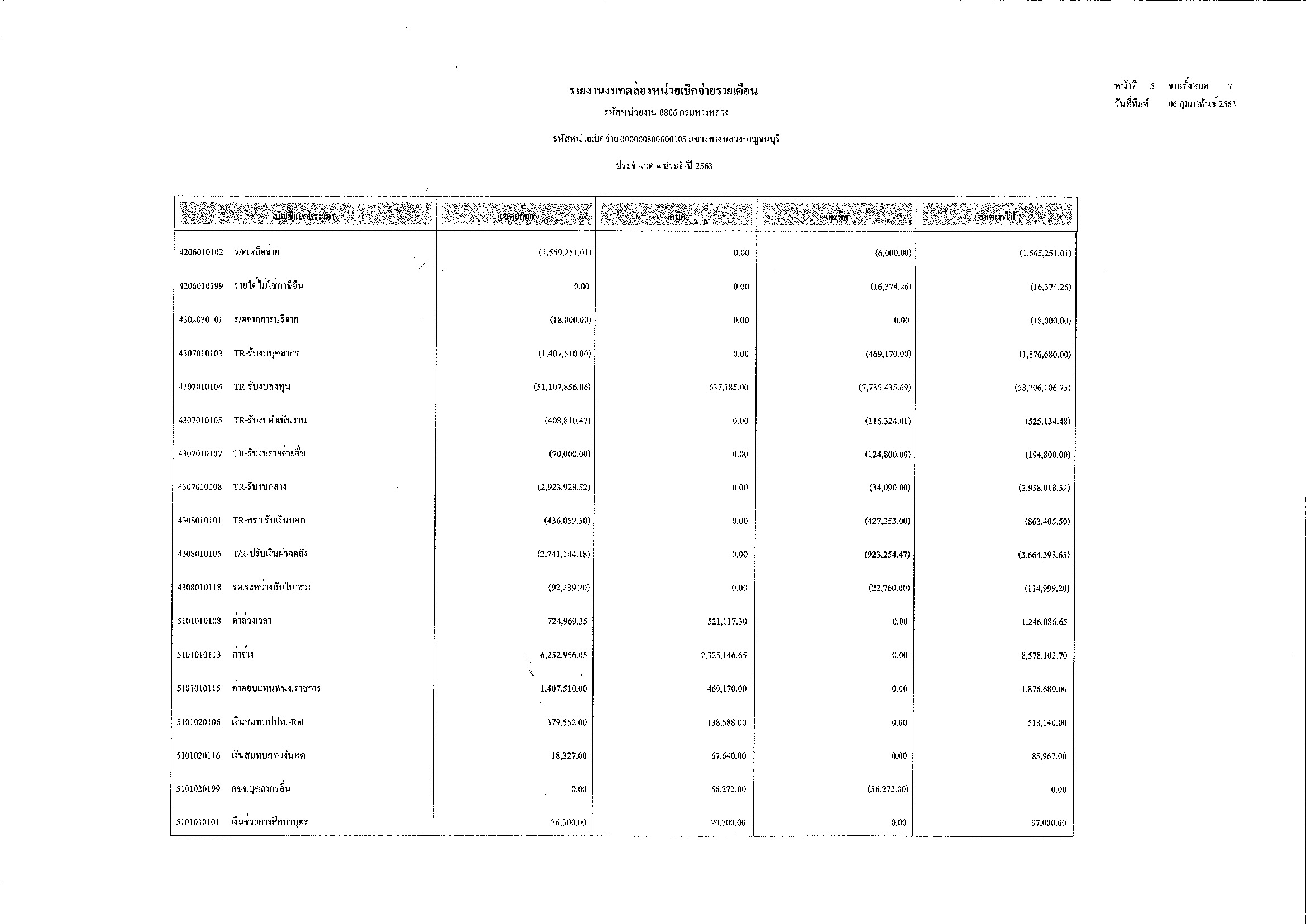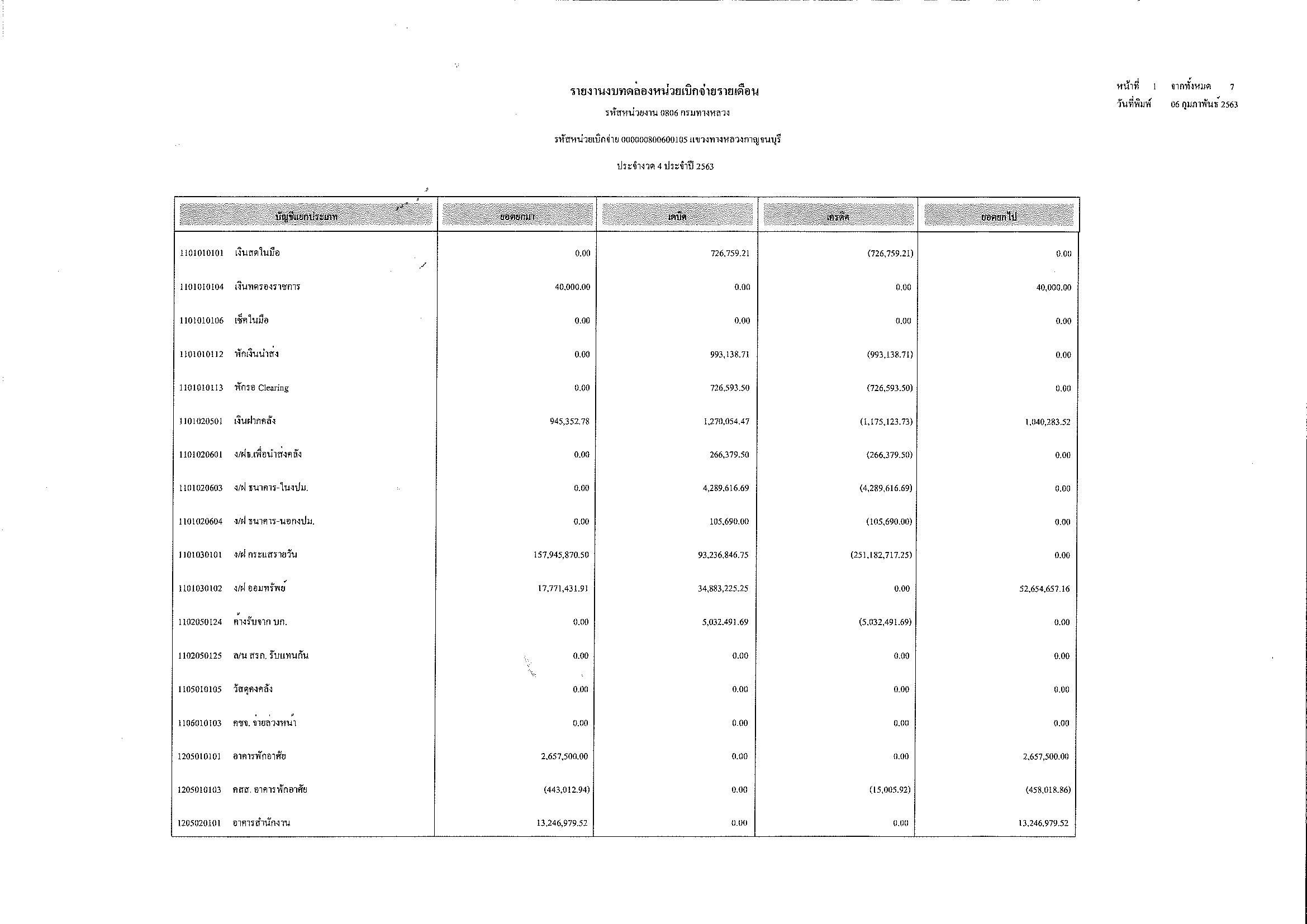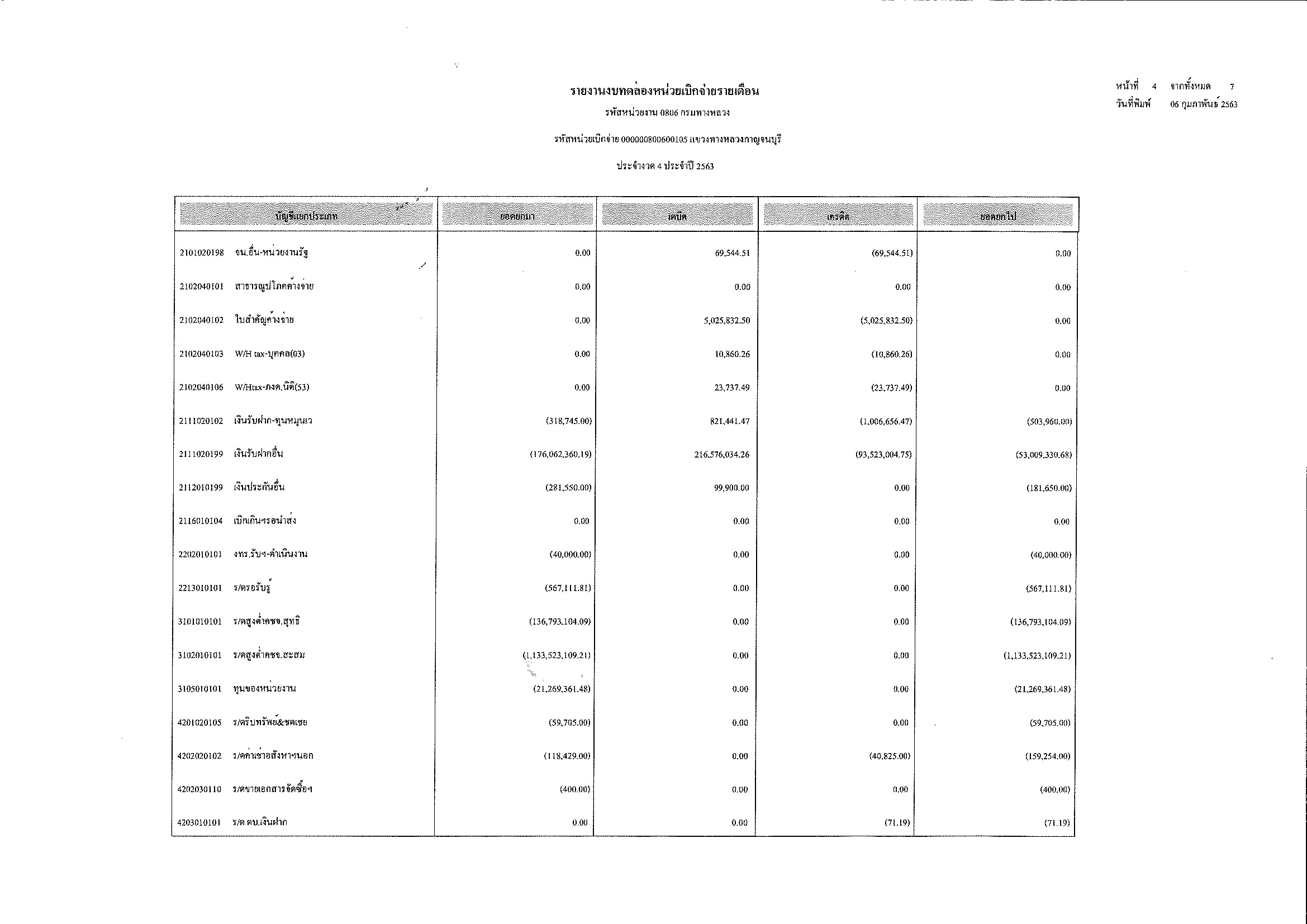 รายงานงบทดลองหน่วยเบิกจ่ายรายเดือน ประจำงวด 4 ประจำปีที่ 2563