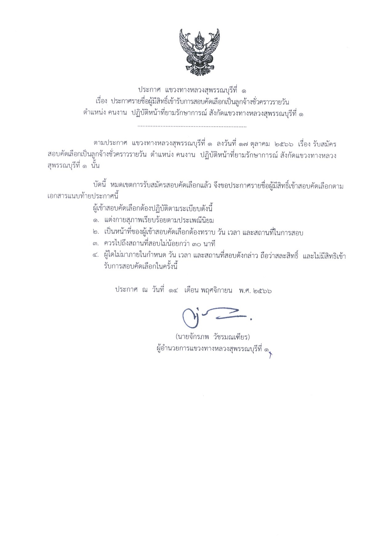 ประกาศรายชื่อผู้มีสิทธิ์เข้ารับการสอบคัดเลือกเป็นลูกจ้างชั่วคราวรายวัน ตำแหน่ง คนงาน ปฏิบัติหน้าที่ยามรักษาการณ์ สังกัดแขวงทางหลวงสุพรรณบุรีที่ 1