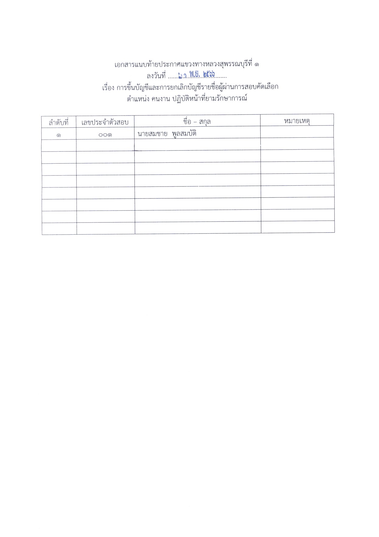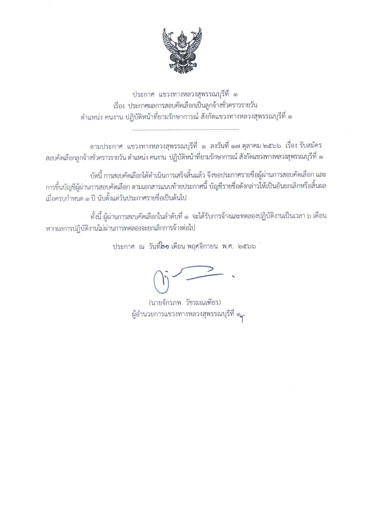 ประกาศผลการสอบคัดเลือกเป็นลูกจ้างชั่วคราวรายวัน ตำแหน่ง คนงาน ปฏิบัติหน้าที่ยามรักษาการณ์ สังกัดแขวงทางหลวงสุพรรณบุรีที่ 1 จำนวน 1 อัตรา รายละเอียดเพิ่มเติม??