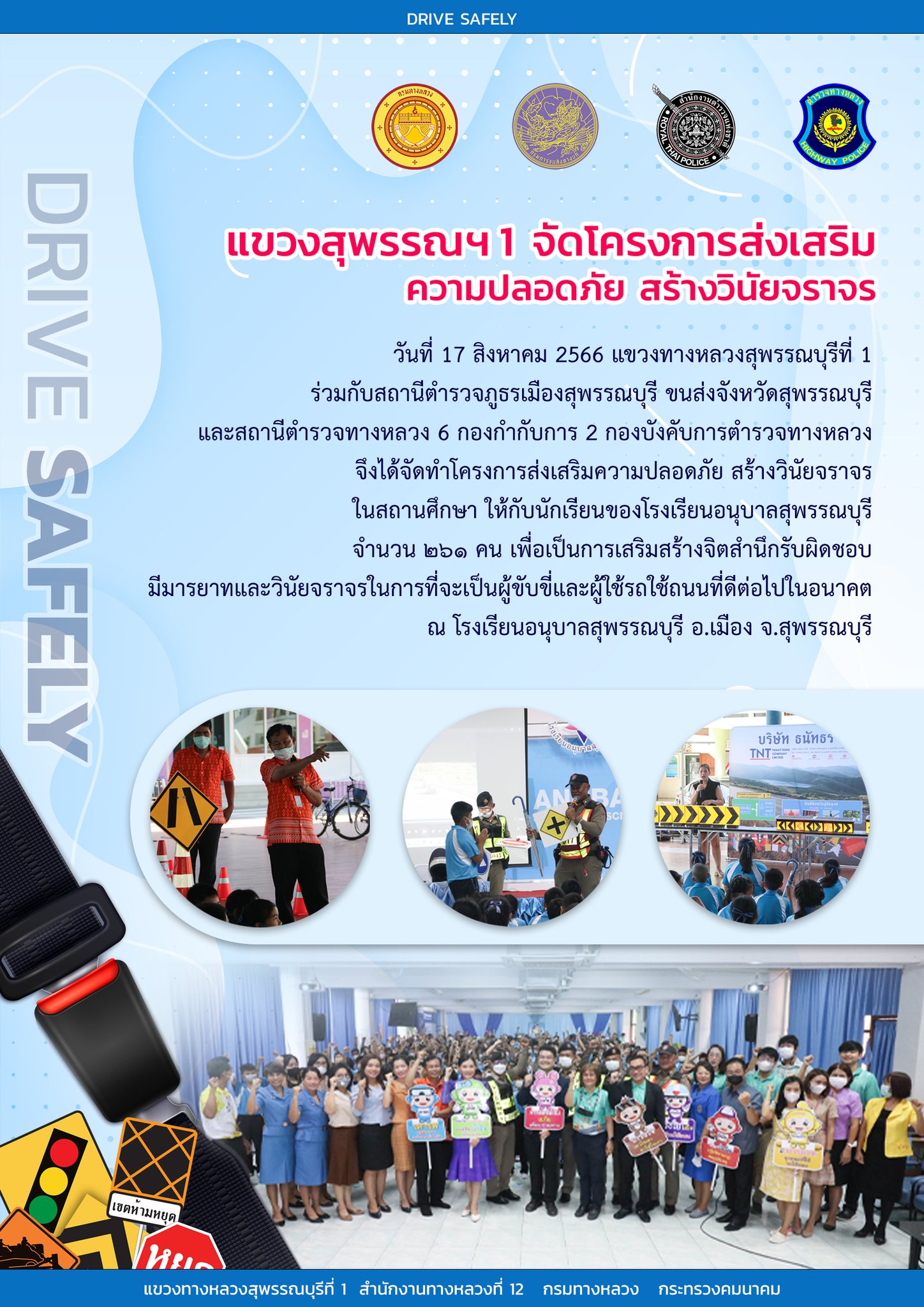 วันที่ 17 สิงหาคม 2566 แขวงทางหลวงสุพรรณบุรีที่ 1 ร่วมกับสถานีตำรวจภูธรเมืองสุพรรณบุรี ขนส่งจังหวัดสุพรรณบุรี และสถานีตำรวจทางหลวง 6 กองกำกับการ 2 กองบังคับการตำรวจทางหลวง จึงได้จัดทำโครงการส่งเสริมความปลอดภัย สร้างวินัยจราจร ในสถานศึกษา ให้กับนักเรียนของโรงเรียนอนุบาลสุพรรณบุรี จำนวน ๒๖๑ คน เพื่อเป็นการเสริมสร้างจิตสำนึกรับผิดชอบ มีมารยาทและวินัยจราจรในการที่จะเป็นผู้ขับขี่และผู้ใช้รถใช้ถนนที่ดีต่อไปในอนาคต และมีภาคเอกชนเข้าร่วมในการให้ความรู้กับน้องๆ จาก บริษัท ธนัทธร จำกัด ณ โรงเรียนอนุบาลสุพรรณบุรี อ.เมือง จ.สุพรรณบุรี