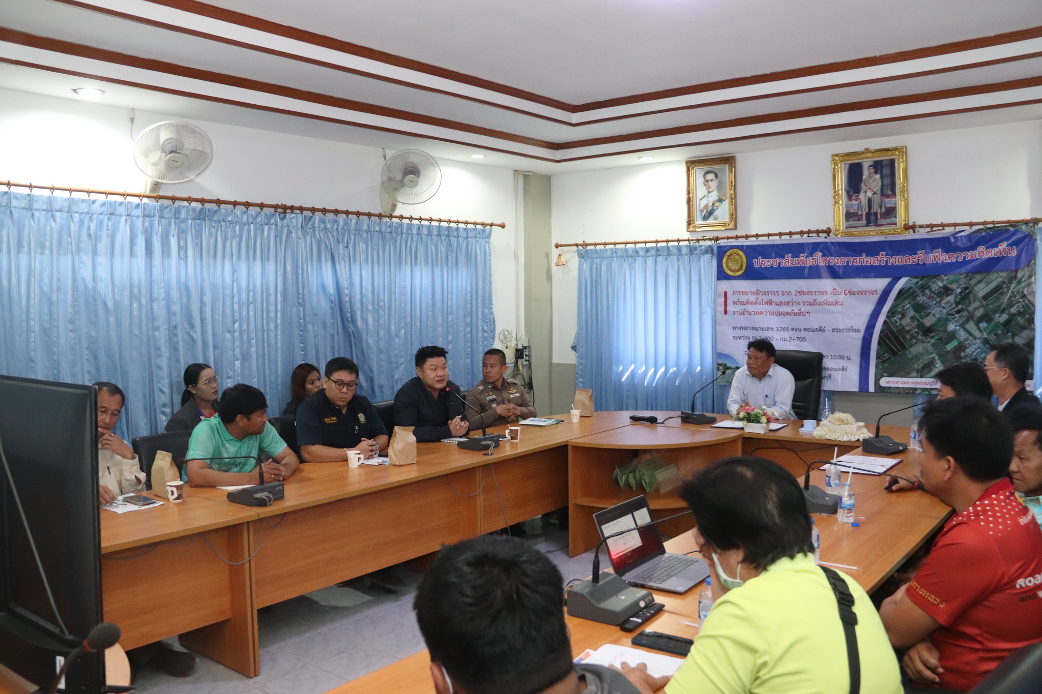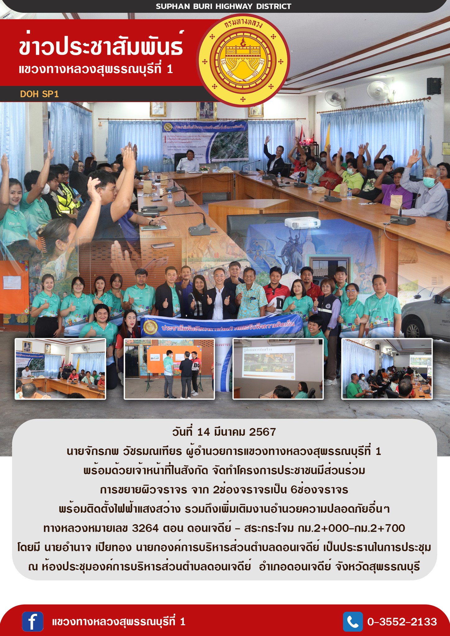 นายจักรภพ วัชรมณเฑียร ผู้อำนวยการแขวงทางหลวงสุพรรณบุรีที่ 1 พร้อมด้วยเจ้าหน้าที่ในสังกัด จัดทำโครงการประชาชนมีส่วนร่วม การขยายผิวจราจร จาก 2ช่องจราจรเป็น 6ช่องจราจร พร้อมติดตั้งไฟฟ้าแสงสว่าง รวมถึงเพิ่มเติมงานอำนวยความปลอดภัยอื่นๆทางหลวงหมายเลข 3264 ตอน ดอนเจดีย์ - สระกระโจม กม.2+000-กม.2+700โดยมี นายอำนาจ เปียทอง นายกองค์การบริหารส่วนตำบลดอนเจดีย์ เป็นประธานในการประชุมณ ห้องประชุมองค์การบริหารส่วนตำบลดอนเจดีย์ อำเภอดอนเจดีย์ จังหวัดสุพรรณบุรี