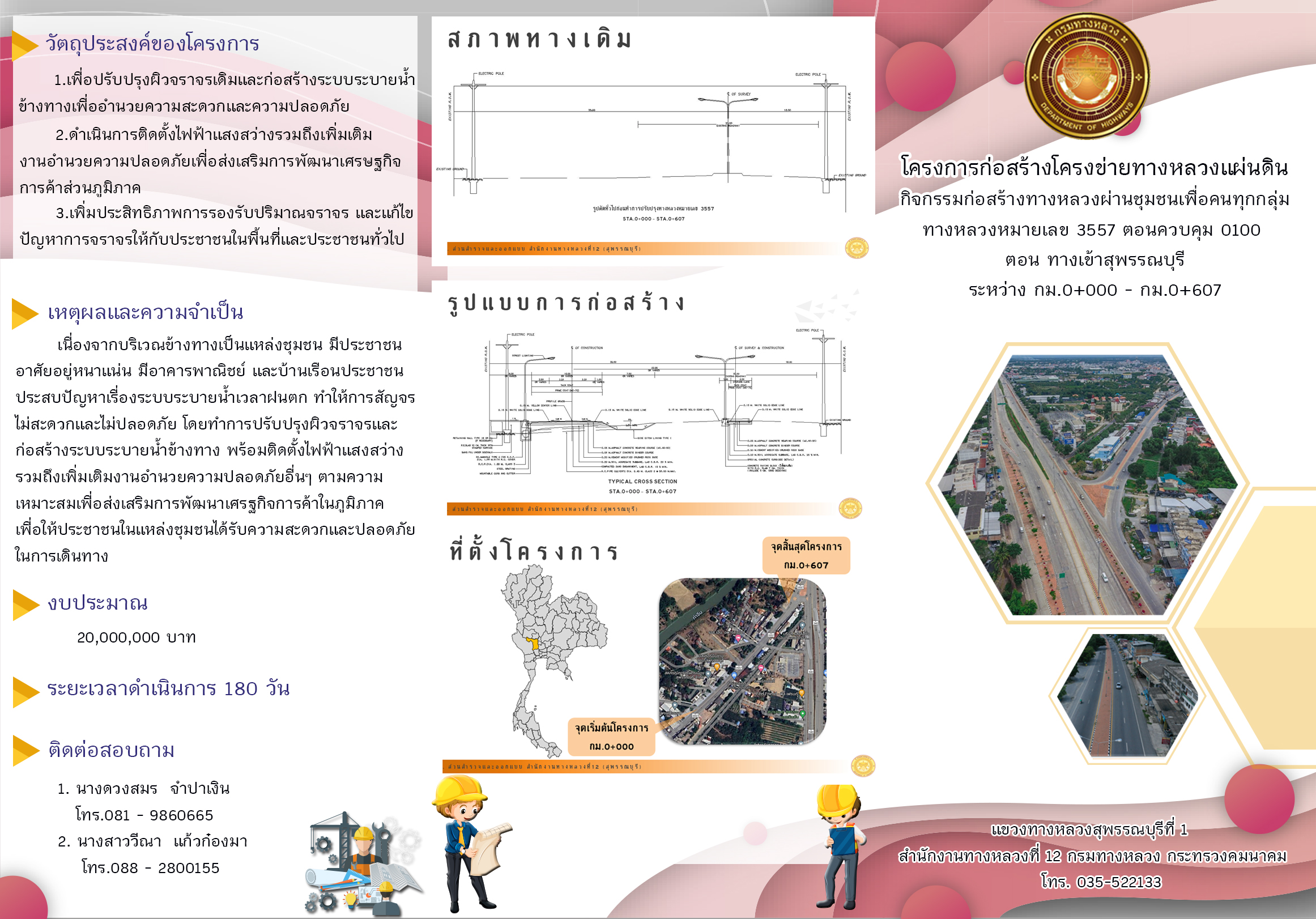 ทำให้การสัญจรไม่สะดวกและไม่ปลอดภัย โดยทำการปรับปรุงผิวจราจรและก่อสร้างระบบระบายน้ำข้างทาง พร้อมติดตั้งไฟฟ้าแสงสว่างรวมถึงเพิ่มเติมงานอำนวยความปลอดภัยอื่นๆ